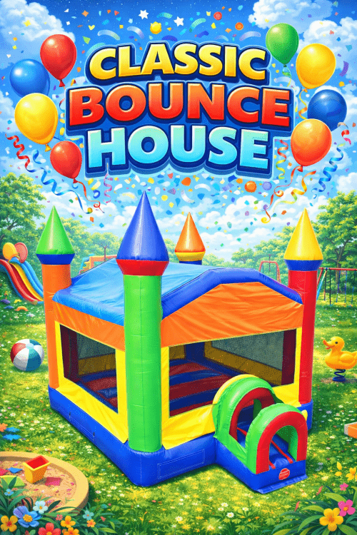 Bring bold color and big fun to any event with our Classic Bounce House! This bright, spacious inflatable is perfect for the younger crowds and offers a large jumping area. Whether it’s a birthday, school event, church gathering, festival, or neighborhood party, this bounce house brings the energy and keeps kids entertained for hours. If you want something that instantly grabs attention and delivers nonstop fun… The Classic Bounce House is your best bet!