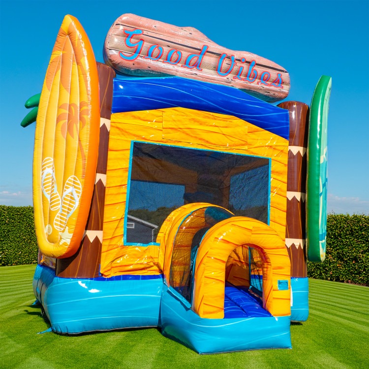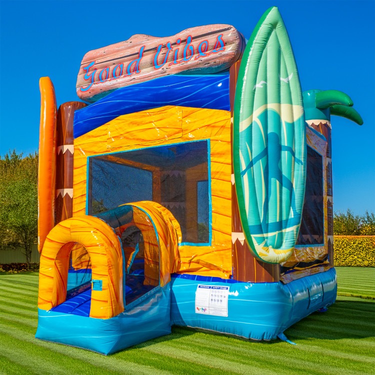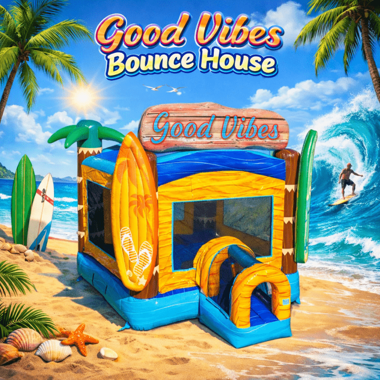 Make your next party unforgettable with our Good Vibes Bounce House! This vibrant, surf-themed inflatable is perfect for birthday parties, school events, church events, family gatherings, festivals, and backyard celebrations. Featuring bright tropical colors and a spacious jumping area, the Good Vibes Bounce House keeps kids entertained while adding a fun, energetic centerpiece to your event.