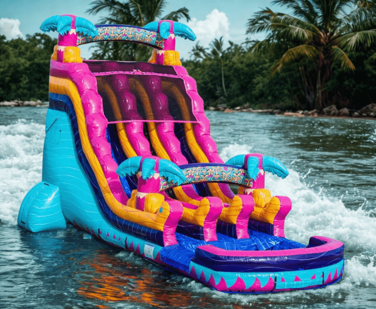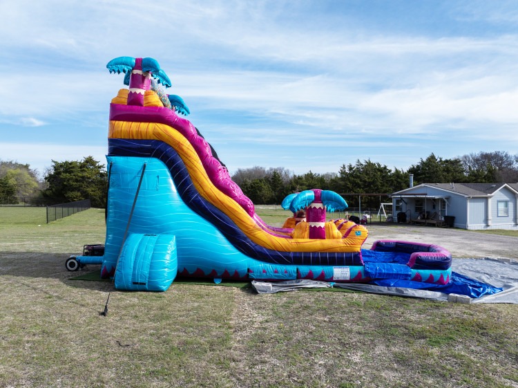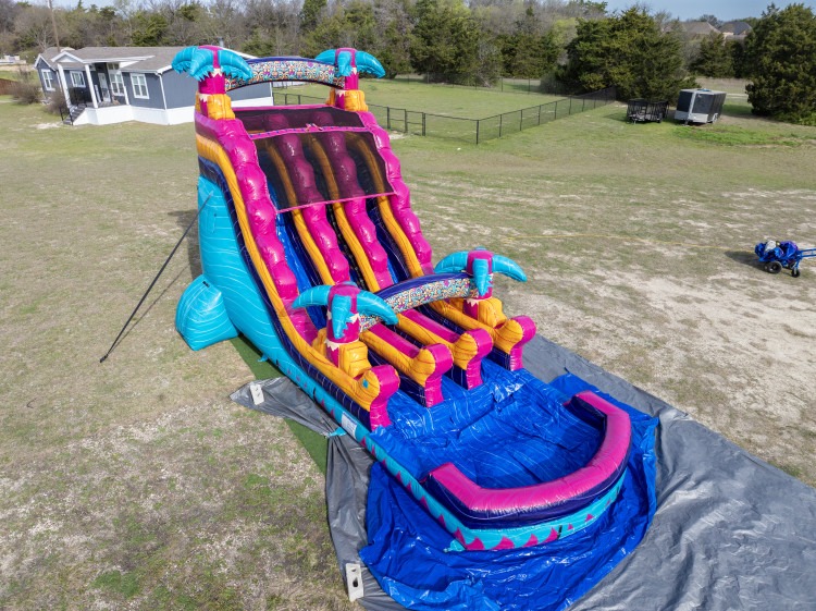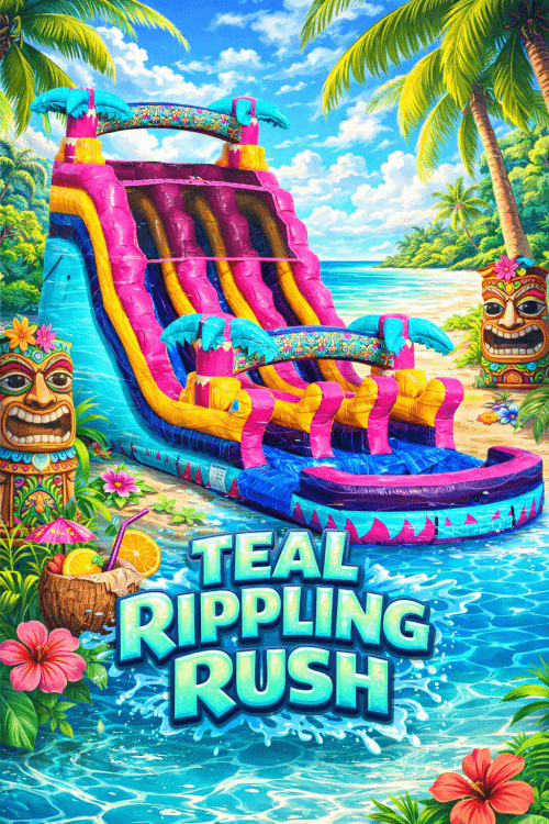 Make a splash with our eye-catching Teal Rippling Rush! This 20 foot dual lane slide delivers fast, refreshing fun and keeps the line moving! Perfect for parties that want big color, big height, and big excitement!